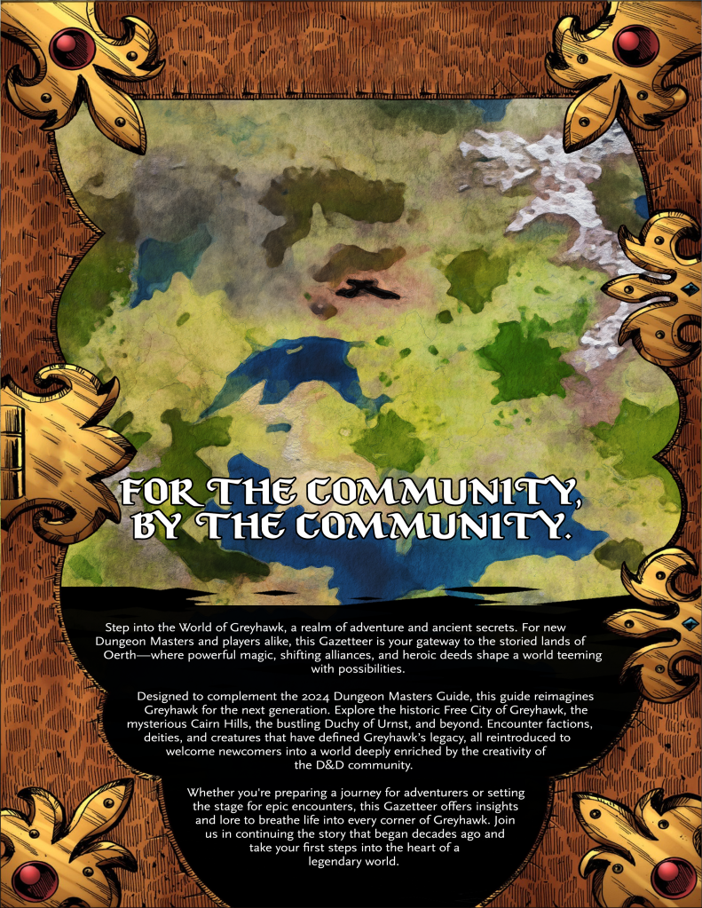Hello everyone. Things have been incredibly busy here at Cannibaal Publishing. It has been a mad rush of a community effort to create the latest product: World of Greyhawk Gazetteer Revised. This book will consist of approximately 84 pages and is meant to be a useful tool for newcomers to Greyhawk. It will help those first being introduced to Greyhawk via the DMG 2024, and provide additional information to help them develop their own Greyhawk Campaign.
