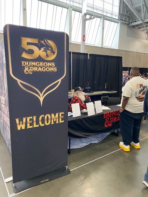 You could wait in a que of a taped off area for Eberron, Legends of Greyhawk which had three different games: Nulb, Hommlet, and The Battle of Emridy Meadows, or a Learn to Play scenario “Tavern Brawl”. We went for a Legends of Greyhawk Scenario and the table rolled for which one that was offered, either Nulb or Hommlet. It was Nulb first. A four hour play session had our DM, DM Sean and six players.