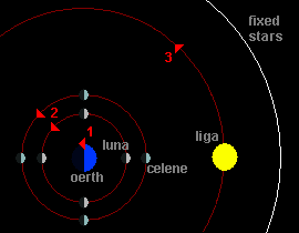 It is well known that Oerth is the center of the Primary Plane. There are 3 massive bodies around it: The sun Liga, and the two moons Luna and its small sister Celene.